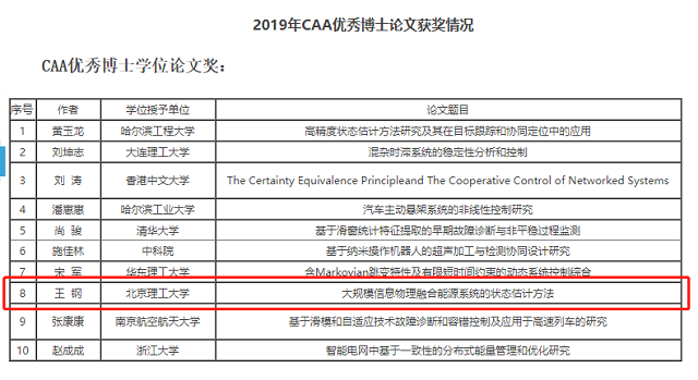 陈杰教授指导的博士生王钢的博士学位论文《大规模信息物理融合能源系统的状态估计方法》获得CAA2019年优秀博士学位论文奖。