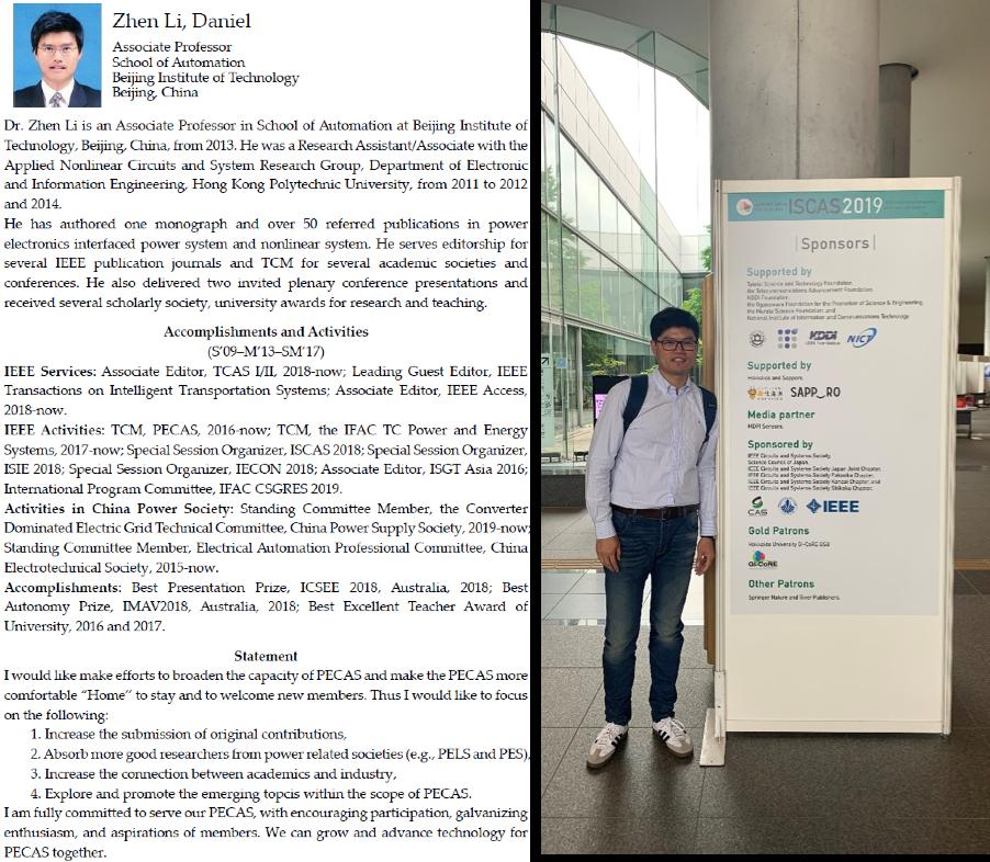 2019年5月25日至29日,做爱视频 青年教师李震副教授出席于日本札幌举行的IEEE电路与系统学会旗舰会议ISCAS2019(IEEE International Symposium on Circuits and Systems)。与会期间,通过IEEE电路与系统学会执行主席提名,学会旗下两大期刊编委会(IEEE Transactions on Circuits and Systems I/II)与能源专委会统一投票,李震副教授成功当选IEEE电路与系统学会能源专委会(PECAS)候任主席(Chair Elect,2021年至2022年),并将于2022年至2023年直接升任总主席,上任后将成为IEEE PECAS三十年历史上第一位来自中国大陆地区的总主席。在2020至2023的四年中,李震副教授将负责IEEE电路与系统学会能源专委会全球事务的管理与推广,并统筹专委会、学会期刊能源领域的发展方向。