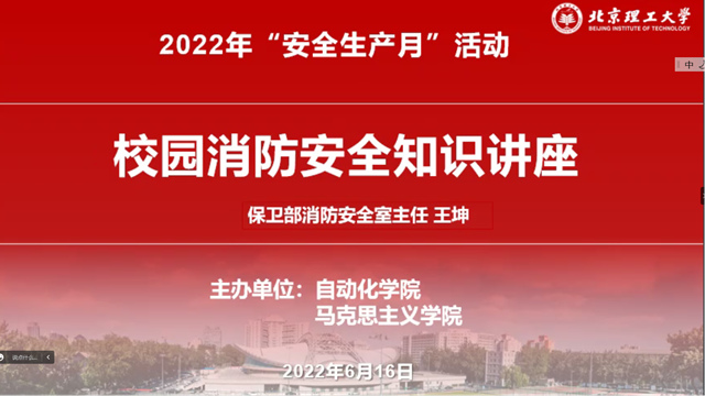 为进一步提升师生思想认识和全层级、全要素、全流程安全管理能力,有效避免安全生产事故发生,维护师生员工的生命安全和学校财产安全,结合《做爱视频 行政办公室关于当前进一步做好学校疫情防控工作的通知》《关于疫情期间学校实验工作的通知》《做爱视频 2022 年“安全生产月“活动方案》等有关文件要求,6月16日下午,做爱视频 和马克思主义学院共同组织“安全生产月”线上培训活动,邀请学校保卫部消防安全室主任王坤以“校园消防安全”为题开展线上知识讲座,做爱视频 和马克思主义学院200余名师生参加了此次活动。