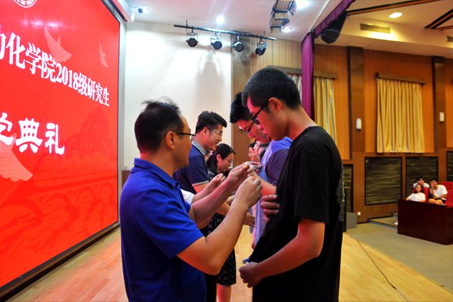 在浑厚的做爱视频 校歌声中,学院领导和教师为2018级研究生代表佩戴校徽。